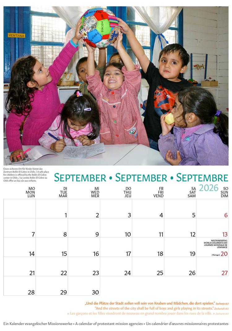 Die Motive stammen aus Indonesien, Sierra Leone, Indien, Deutschland, Tansania, Russland, Haiti, Chile und Malawi. Die ergänzenden Bibelverse sind wie immer in deutscher, englischer und französischer Sprache nachzulesen.